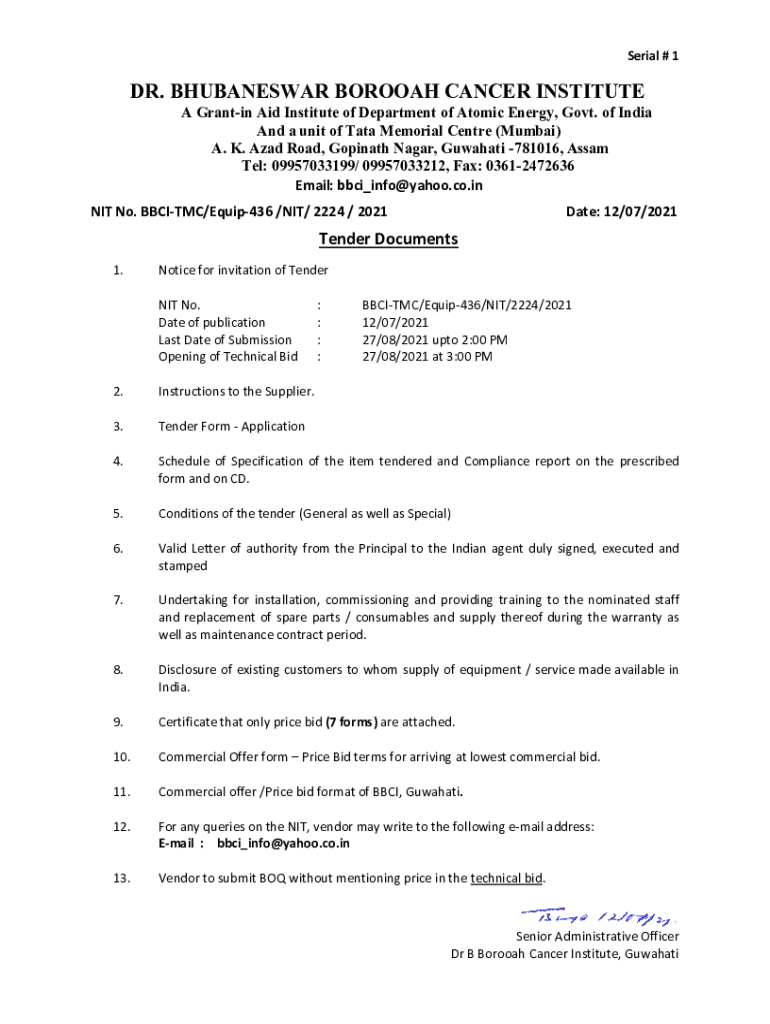 Serial # 1DR. BHUBANESWAR BOROUGH CANCER INSTITUTE A Granting Aid Institute of Department of Atomic Energy, Govt. of India And a unit of Tata Memorial Center (Mumbai) A. K. Azad Road, Goliath Nagar,