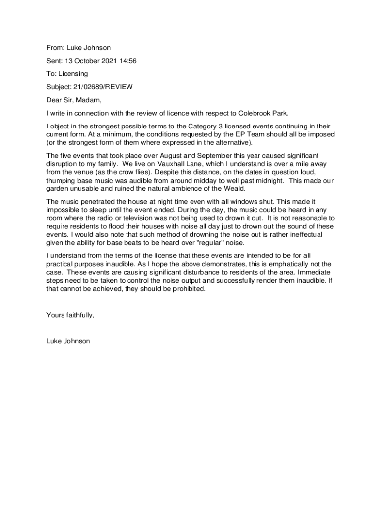 From: Luke Johnson Sent: 13 October 2021 14:56 To: Licensing Subject: 21/02689/REVIEW Dear Sir, Madam, I write in connection with the review of license with respect to Cole brook Park. I object in