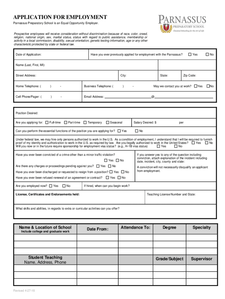 APPLICATION FOR EMPLOYMENT Parnassus Preparatory School is an Equal Opportunity Employer. Prospective employees will receive consideration without discrimination because of race, color, creed, religion,