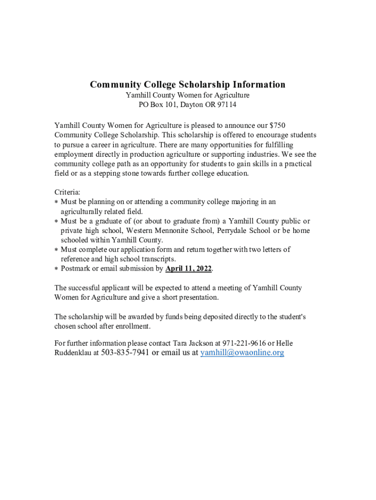 Community College Scholarship Information Yam hill County Women for Agriculture PO Box 101, Dayton OR 97114 Yam hill County Women for Agriculture is pleased to announce our $750 Community College