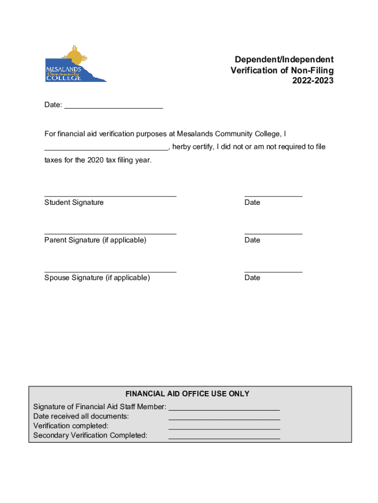 Dependent/Independent Verification of Confining 20222023 Date: ___ For financial aid verification purposes at Mesa lands Community College, I ___, Derby certify, I did not or am not required to file