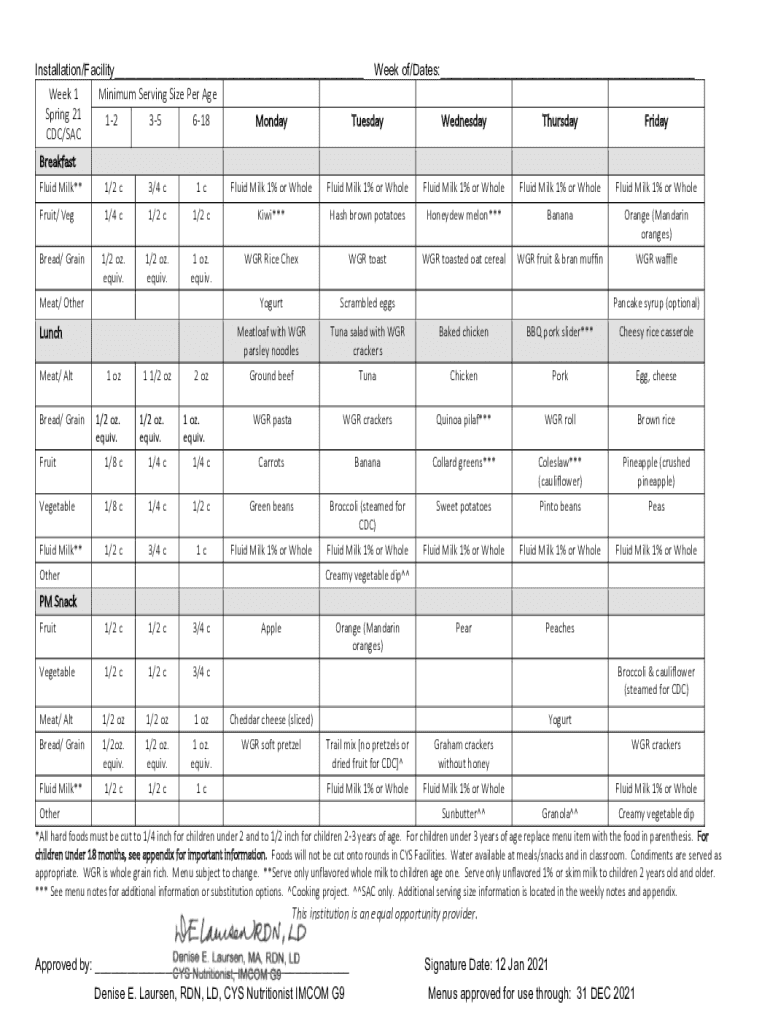 Installation/Facility___ Week of/Dates:___ Week 1 Minimum Serving Size Per Age Spring 21 12 35 618 Monday Tuesday Wednesday Thursday Friday CDC/SAC Breakfast Fluid Milk**1/2 c3/4 c1cFluid Milk 1%