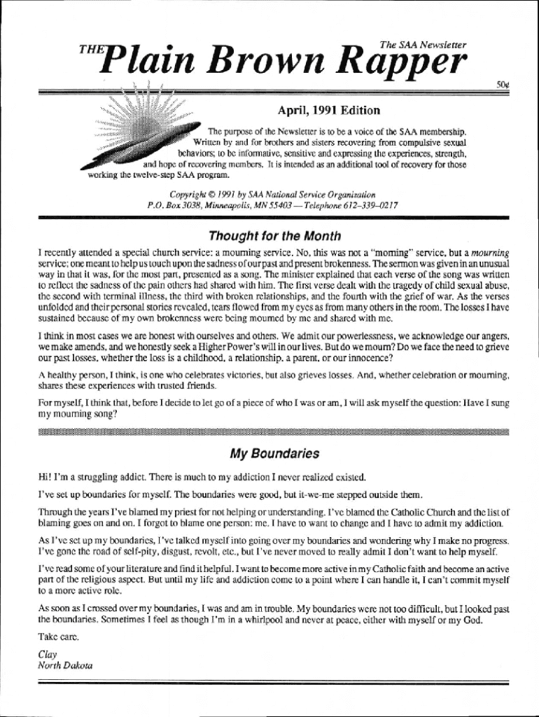 Teethe SAA Newsletter Brown Rapper500April, 1991 Edition The purpose of the Newsletter is to be a voice of the SAA membership. Written by and for brothers and sisters recovering from compulsive sexual