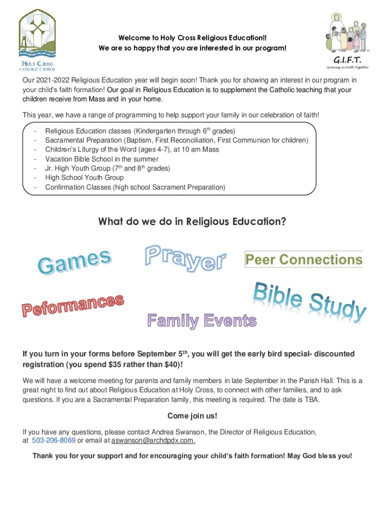Welcome to Holy Cross Religious Education!! We are so happy that you are interested in our program! Our 20212022 Religious Education year will begin soon! Thank you for showing an interest in our