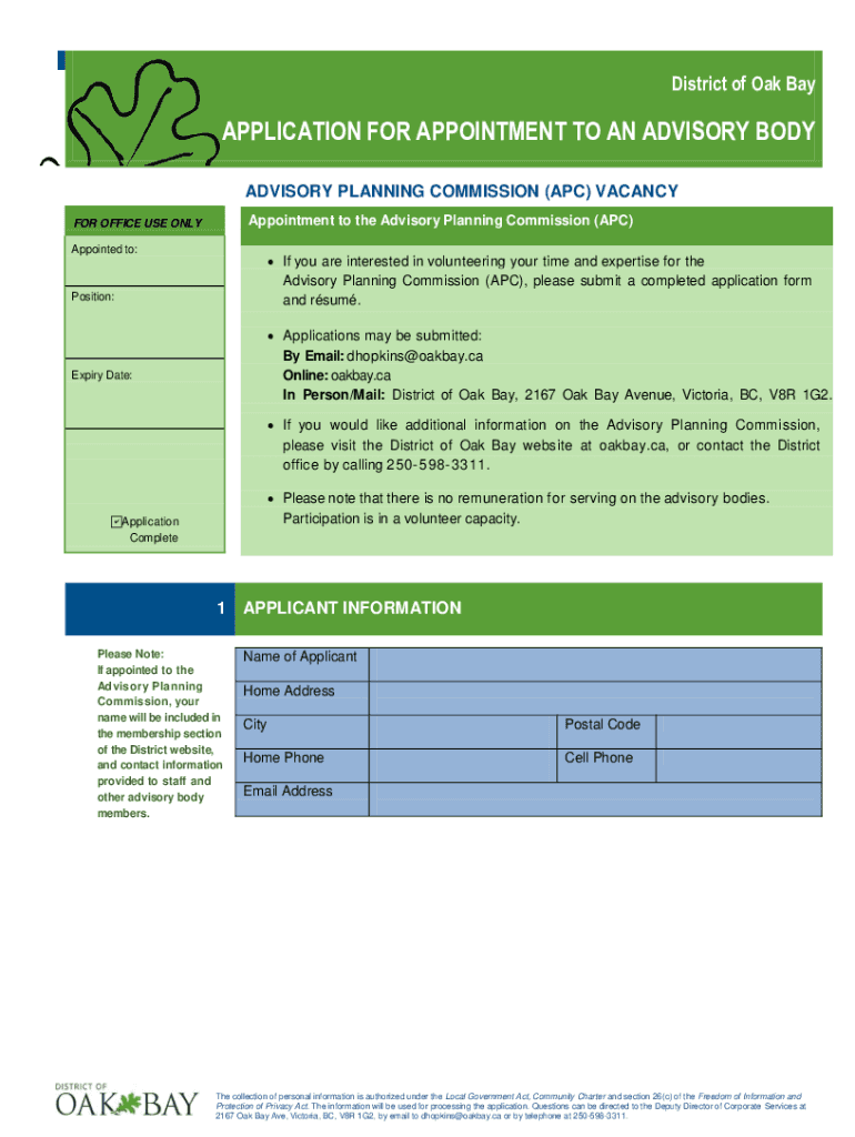 District of Oak Application FOR APPOINTMENT TO AN ADVISORY BODY ADVISORY PLANNING COMMISSION (APC) VACANCY Appointment to the Advisory Planning Commission (APC)FOR OFFICE USE ONLY Appointed to: If
