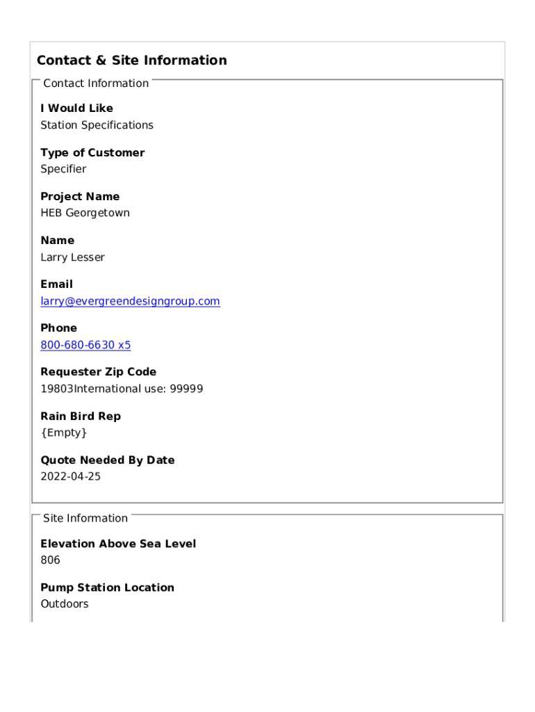 Contact & Site Information Contact Information I Would Like Station Specifications Type of Customer Specifier Project Name HEB Georgetown Name Larry Lesser Email larry@evergreendesigngroup.com Phone