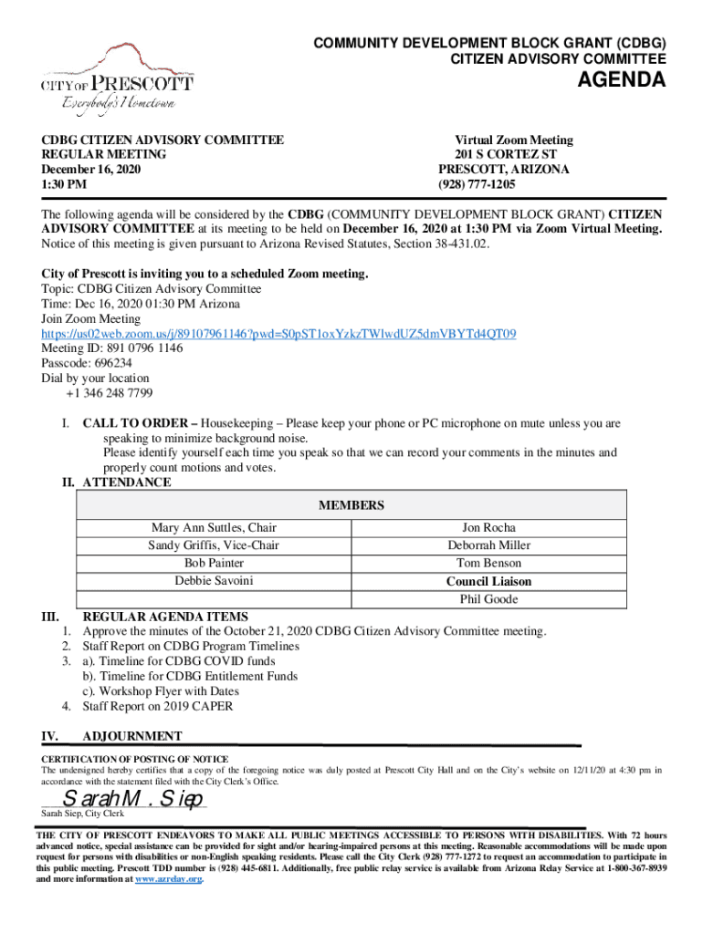 COMMUNITY DEVELOPMENT BLOCK GRANT (CBG) CITIZEN ADVISORY COMMITTEEAGENDA CBG CITIZEN ADVISORY COMMITTEE REGULAR MEETING December 16, 2020 1:30 Virtual Zoom Meeting 201 S CORTEZ ST PRESCOTT, ARIZONA