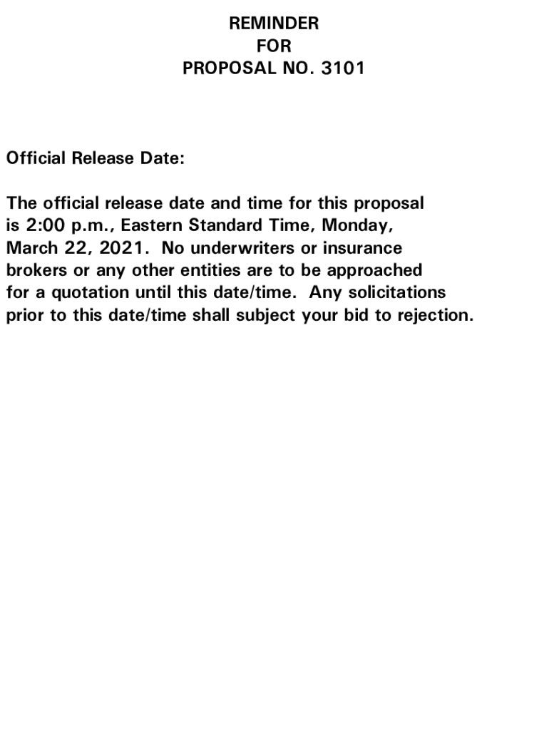REMINDER FOR PROPOSAL NO. 3101Official Release Date: The official release date and time for this proposal is 2:00 p.m., Eastern Standard Time, Monday, March 22, 2021. No underwriters or insurance