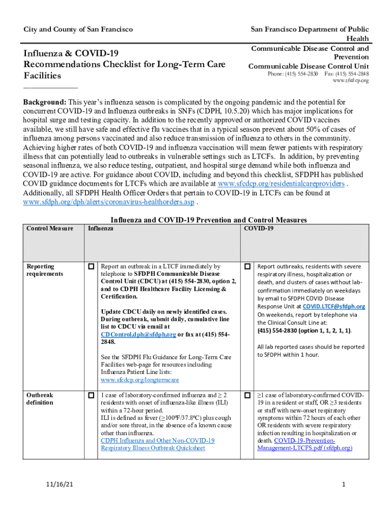 City and County of San FranciscoInfluenza & COVID-19 Recommendations Checklist for Longer Care Facilities San Francisco Department of Public Health Communicable Disease Control and Prevention Communicable