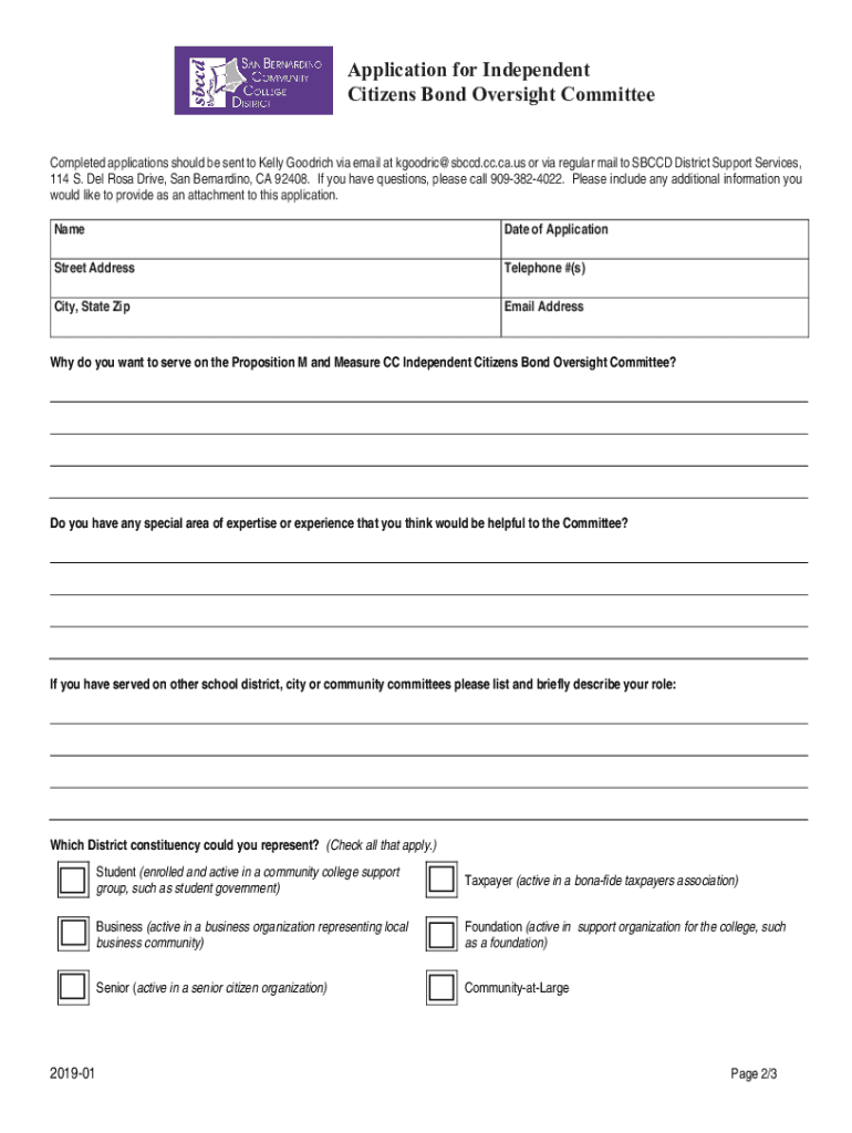 Application for Independent Citizens Bond Oversight Committee The Board of Trustees of the San Bernardino Community College District (District) is seeking qualified, interested individuals to serve