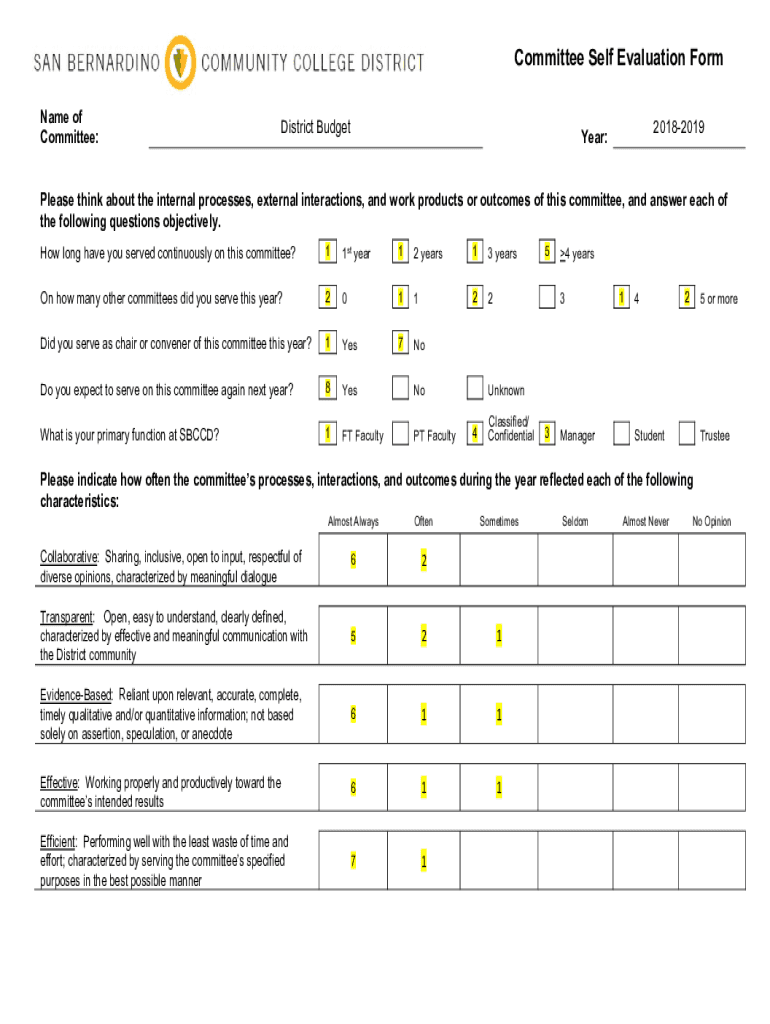 Committee Self Evaluation Form Name of Committee:District Budget20182019Year:Please think about the internal processes, external interactions, and work products or outcomes of this committee, and