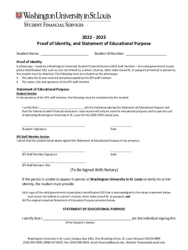 2022 2023 Proof of Identity, and Statement of Educational Purpose Student Name: ___Student ID Number: ___Proof of Identity photocopy made by a Washington University Student Financial Services (SFS)