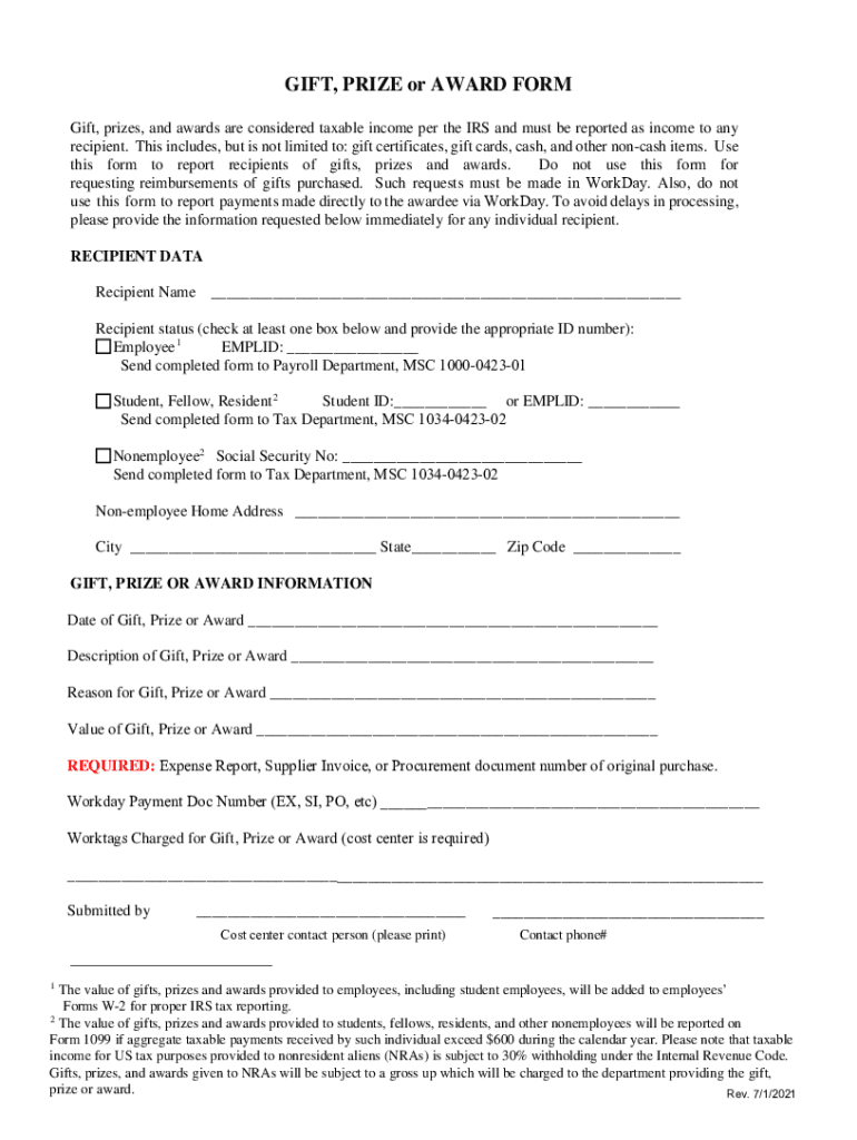 GIFT, PRIZE or AWARD FORM Gift, prizes, and awards are considered taxable income per the IRS and must be reported as income to any recipient. This includes, but is not limited to: gift certificates,