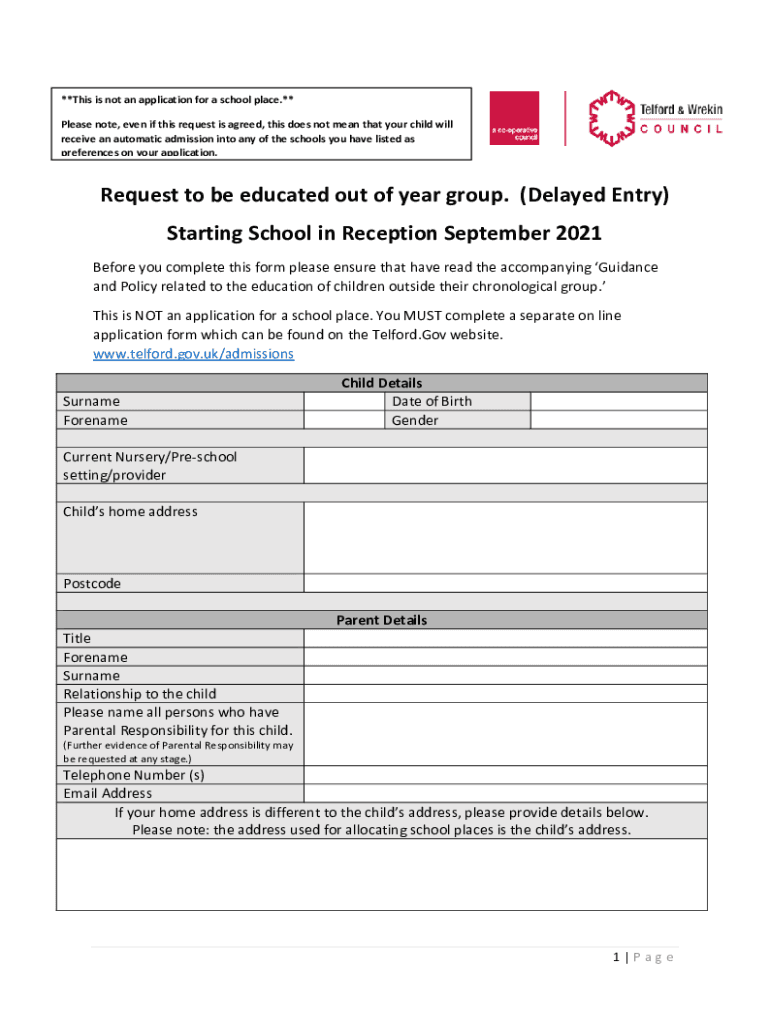 Get the free Request to be educated out of year group. (Delayed Entry ...