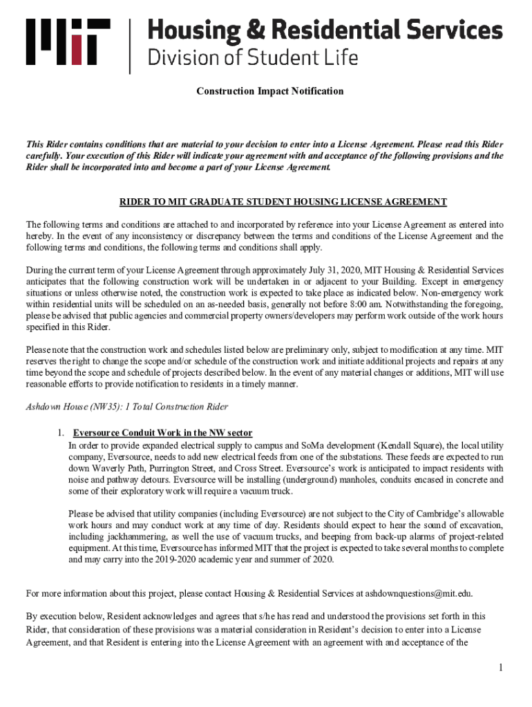 Construction Impact Notifications Rider contains conditions that are material to your decision to enter into a License Agreement. Please read this Rider carefully. Your execution of this Rider will