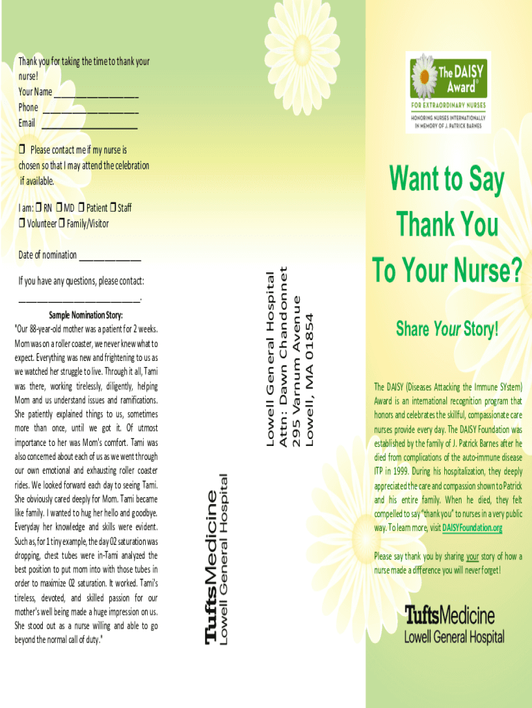 Thank you for taking the time to thank your nurse! Your Name ___ Phone ___ Email ___ r Please contact me if my nurse is chosen so that I may attend the celebration if available. I am: r RN r MD r