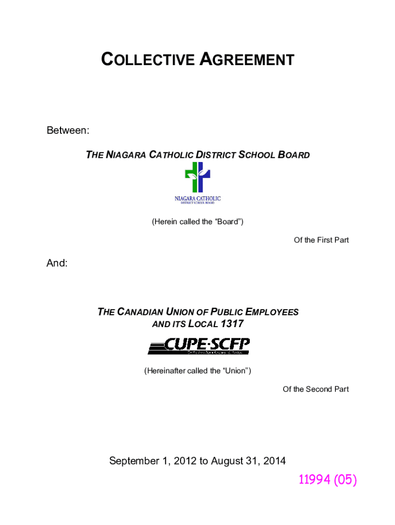 COLLECTIVE AGREEMENTBetween: THE NIAGARA CATHOLIC DISTRICT SCHOOL BOARD(Herein called the Board) Of the First Portland:THE CANADIAN UNION OF PUBLIC EMPLOYEES AND ITS LOCAL 1317(Hereinafter called