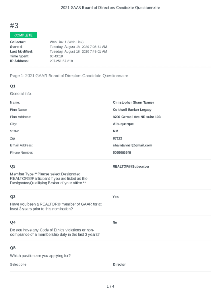 2021 GAAR Board of Directors Candidate Questionnaire#3 COMPLETE Collector: Started: Last Modified: Time Spent: IP Address:Web Link 1 (Web Link) Tuesday, August 18, 2020 7:05:41 AM Tuesday, August