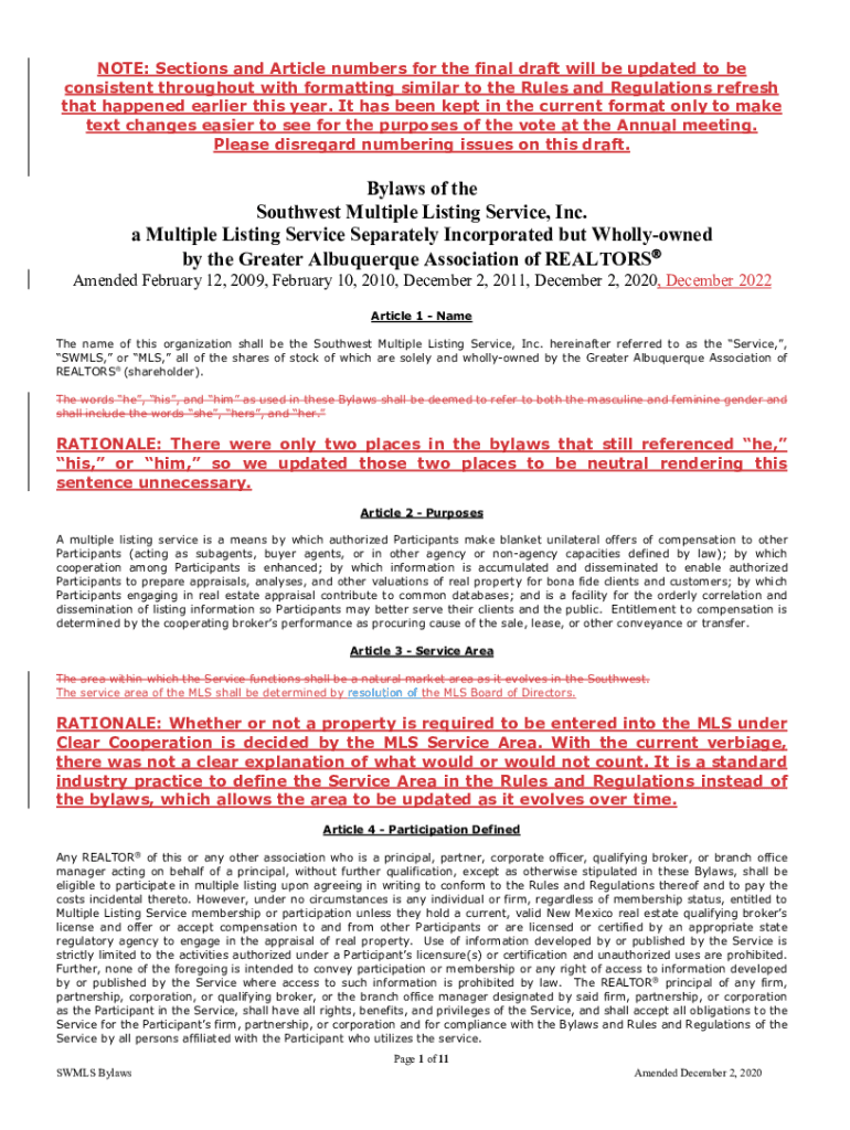 Revised bylaws- swmls are updated rules and regulations that govern the SouthwestMLS organization.