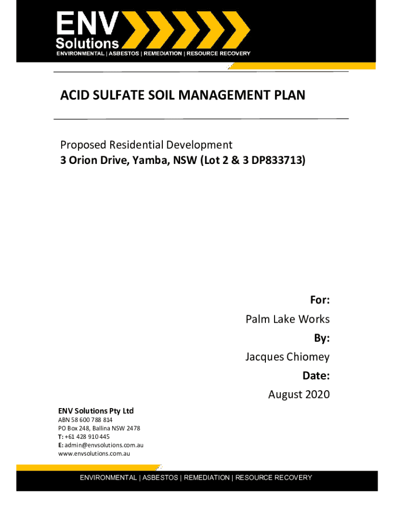ACID SULFATE SOIL MANAGEMENT PLANProposed Residential Development 3 Orion Drive, Samba, NSW (Lot 2 & 3 DP833713)For: Palm Lake Works By: Jacques Chroma Date: August 2020 ENV Solutions Pty Ltd ABN