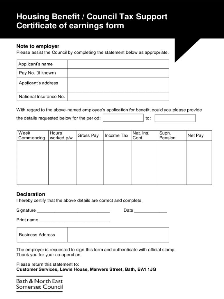 Housing Benefit / Council Tax Support Certificate of earnings form Note to employer Please assist the Council by completing the statement below as appropriate. Applicants name Pay No. (if known) Applicants