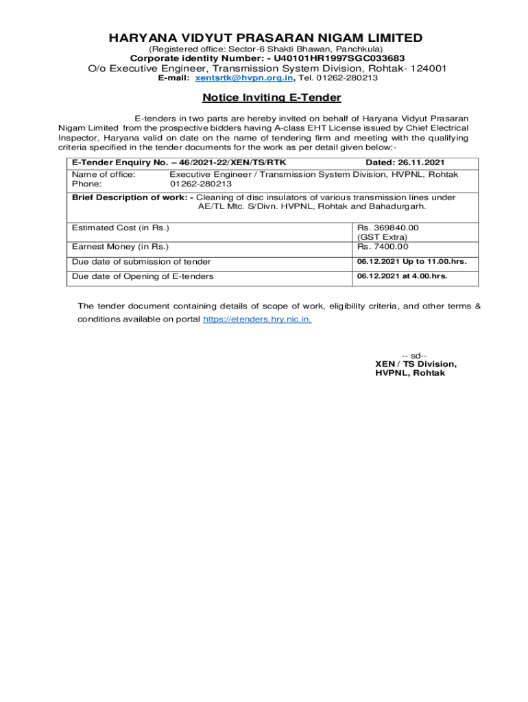 1HARYANA VILYUI PRUSSIAN NI GAM LIMITED (Registered office: Sector6 Shakti Shawn, Patchouli)Corporate identity Number: U40101HR1997SGC033683O/o Executive Engineer, Transmission System Division, Rota