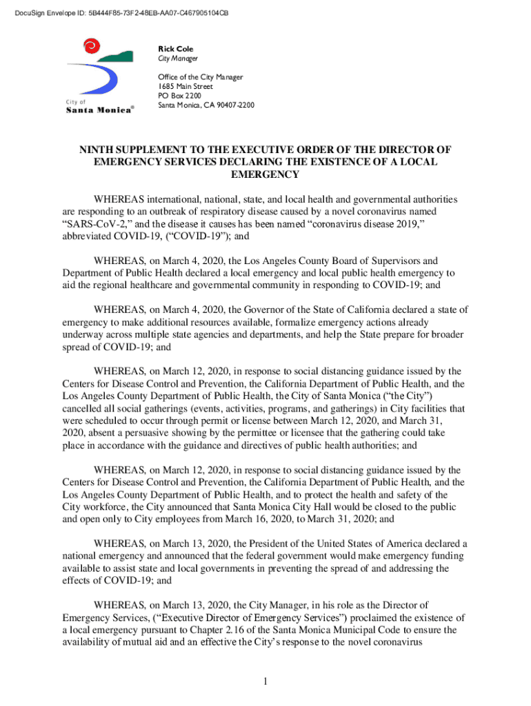 DocuSign Envelope ID: 5B444F8573F248EBAA07C467905104CBRick Cole City Manager Office of the City Manager 1685 Main Street PO Box 2200 Santa Monica, CA 904072200NINTH SUPPLEMENT TO THE EXECUTIVE ORDER