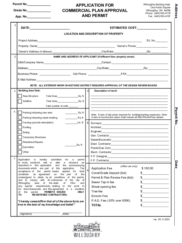 APPLICATION FOR COMMERCIAL PLAN APPROVAL AND PERMITGrade No.___ App. No.___ 1DATE:___Willougbhy Building Dept. One Public Square Willougbhy, OH 44094 Phone: (440) 9534118 Fax: (440) 9534167ESTIMATED