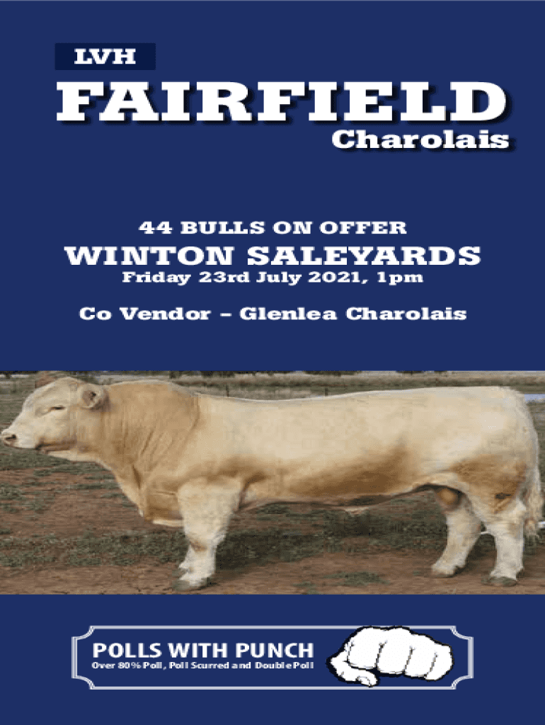 LVHFAIRFIELDCharolais44 BULLS ON OFFERWINTON HALYARDS Friday 23rd July 2021, 1pmCo Vendor Glen lea CharolaisPOLLS WITH PUNCH Over 80% Poll, Poll Spurred and Double Poll Lot 1Lot 2Lot 3WINTON HALYARDS