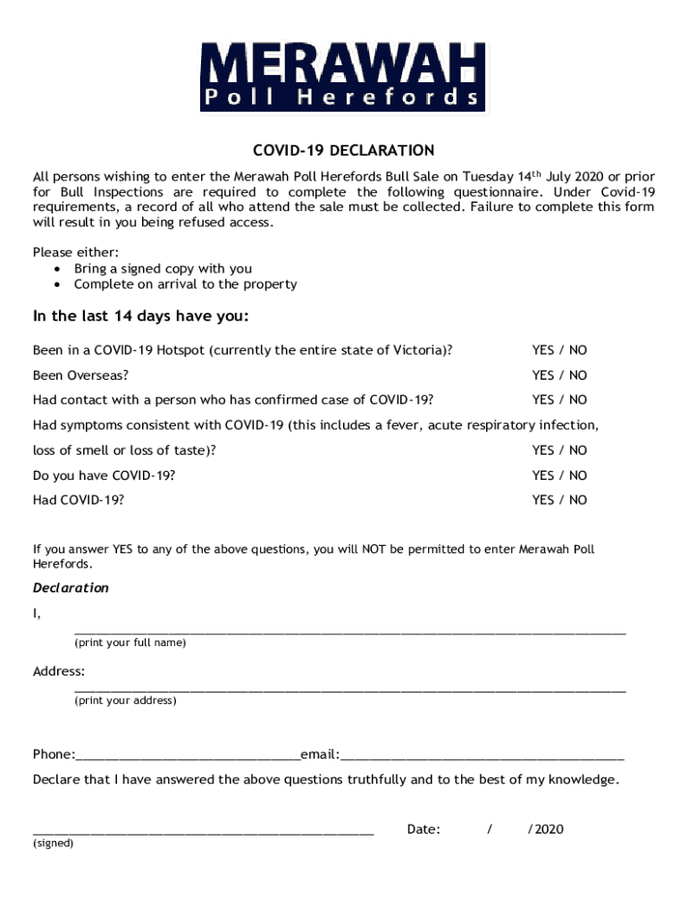 COVID-19 DECLARATION All persons wishing to enter the Messiah Poll Herefords Bull Sale on Tuesday 14th July 2020 or prior for Bull Inspections are required to complete the following questionnaire.