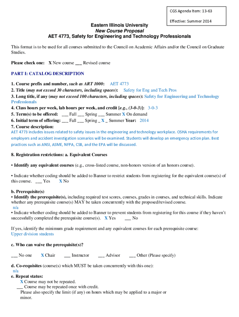 CGS Agenda Item: 1363 Effective: Summer 2014Eastern Illinois University New Course Proposal AET 4773, Safety for Engineering and Technology ProfessionalsThis format is to be used for all courses submitted