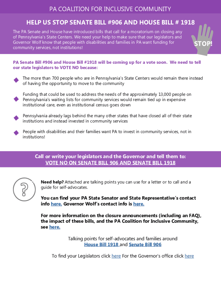 PA COALITION FOR INCLUSIVE COMMUNITY HELP US STOP SENATE BILL #906 AND HOUSE BILL # 1918The PA Senate and House have introduced bills that call for a moratorium on closing any of Pennsylvania's State
