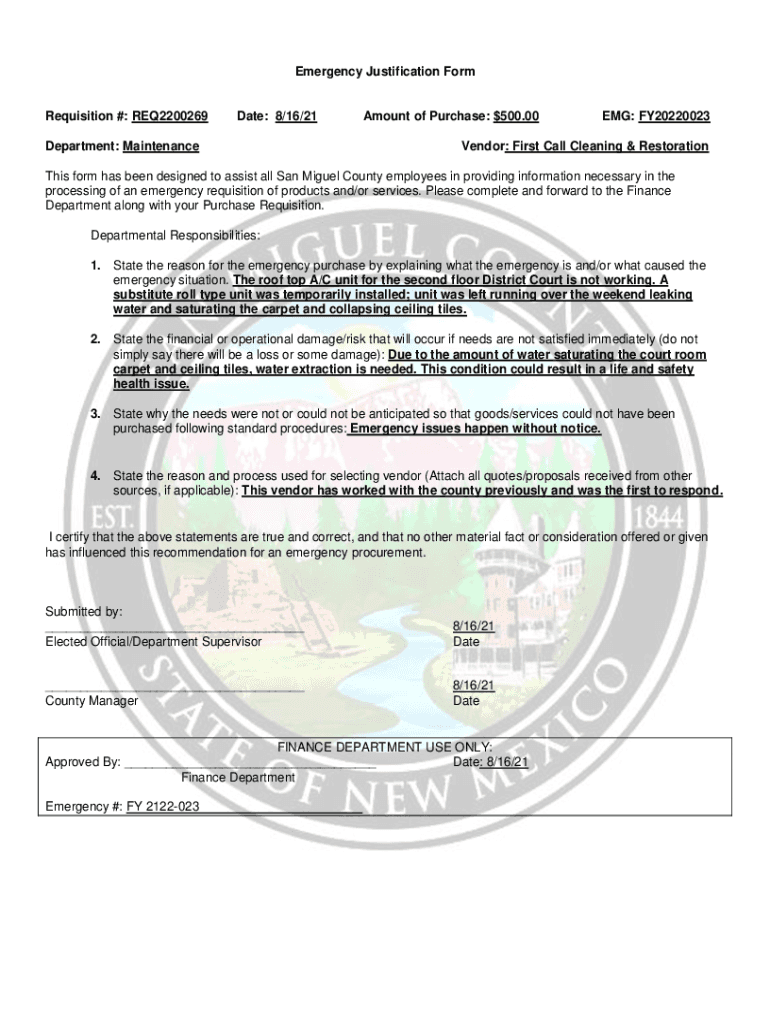Emergency Justification FormRequisition #: REQ2200269Date: 8/16/21Department: MaintenanceAmount of Purchase: $500.00EMG: FY20220023Vendor: First Call Cleaning & Restorations form has been designed