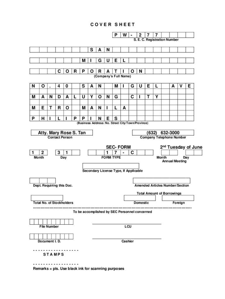 COVER SHEET PW 277S. E. C. Registration NumberCORSANMIGUELPORATION(Companies Full Name)NO.40MANDAMETROPHILILPSANMUYONGMANILPINESIGUELCITYAVEA(Business Address: No. Street City/Town/Province)Atty.