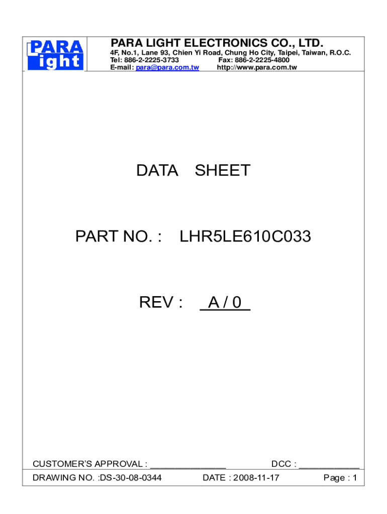 PARA LIGHT ELECTRONICS CO., LTD. 4F, No.1, Lane 93, Chain I Rode, Chung Ho City, Taipei, Taiwan, R.O.C. Tel: 886222253733 Fax: 886222254800 Email: para@para.com.tw http://www.para.com.twDATA SWEETHEART