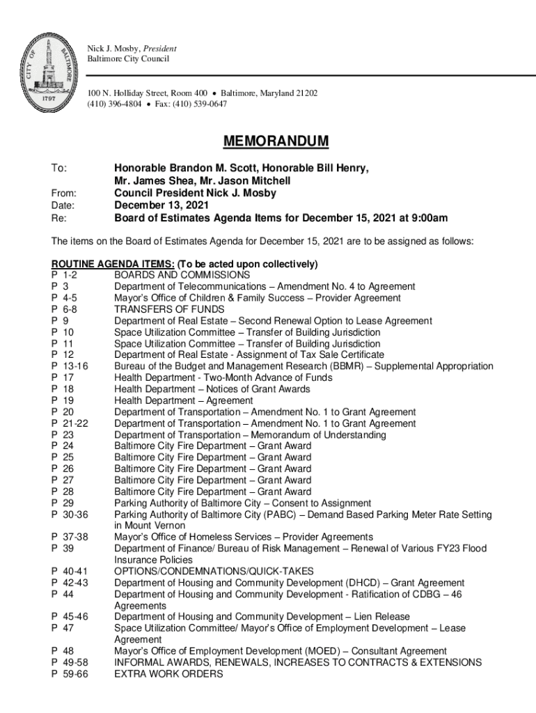 Nick J. Cosby, President Baltimore City Council100 N. Holiday Street, Room 400 Baltimore, Maryland 21202 (410) 3964804 Fax: (410) 5390647MEMORANDUM To: From: Date: Re:Honorable Brandon M. Scott, Honorable