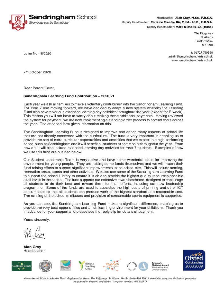 Headteacher: Alan Gray, M.Sc., F.R.S.A. Deputy Headteacher: Caroline Creamy, BA, M. Ed., Ed. D., F.R.S.A. Deputy Headteacher: Mark Nicholls, BA (Hons) The Ridgeway St Albany Hertfordshire AL4 9NXLetter