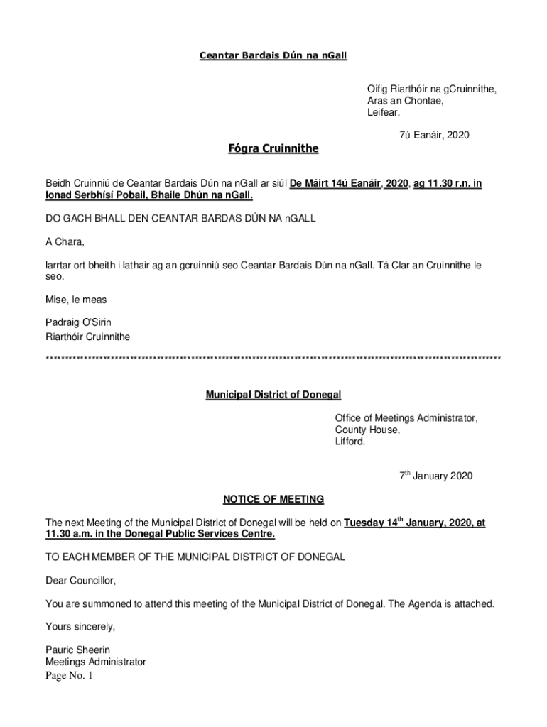 Get the free Beidh Cruinni de Ceantar Bardais Dn na nGall ar sil De Mirt 14 Eanir, 2020, ag 11