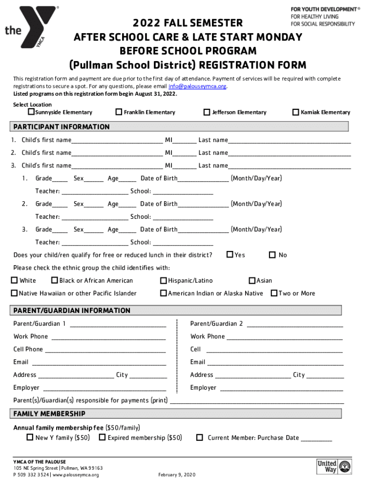 2022 FALL SEMESTER AFTER SCHOOL CARE & LATE START MONDAY BEFORE SCHOOL PROGRAM (Pullman School District) REGISTRATION From This registration form and payment are due prior to the first day of attendance.
