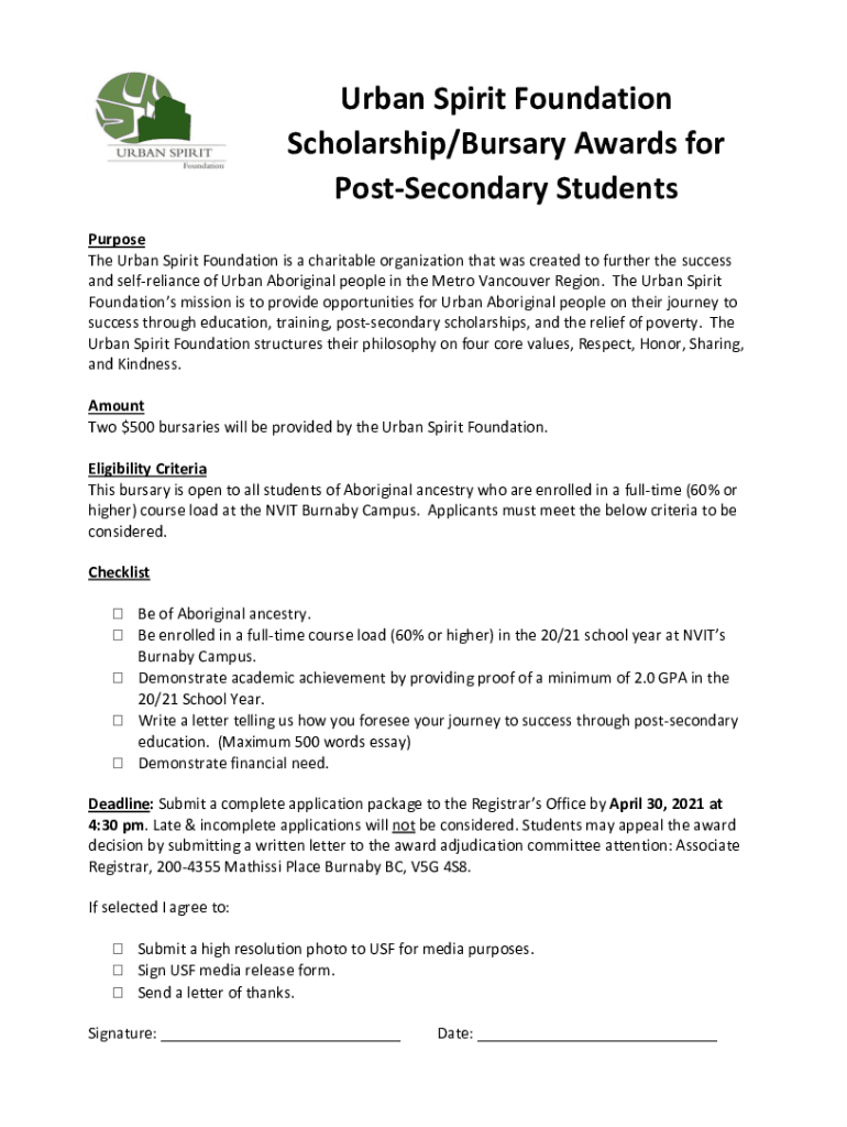 Urban Spirit Foundation Scholarship/Bursary Awards for PostSecondary Students Purpose The Urban Spirit Foundation is a charitable organization that was created to further the success and self-reliance
