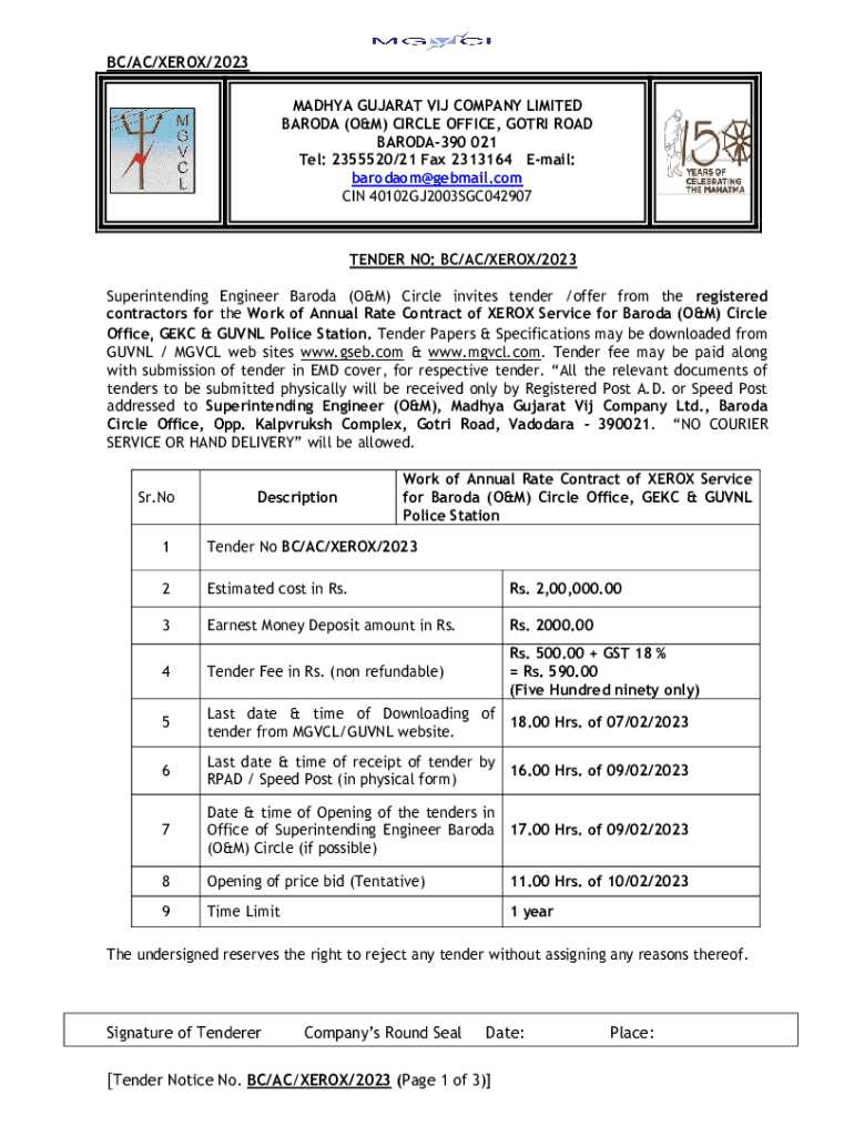 BC/AC/XEROX/2023 MADHYA GUJARAT VIA COMPANY LIMITED BARODA (O&M) CIRCLE OFFICE, GO TRI ROAD BARODA390 021 Tells: 2355520/21 Fax 2313164 Email: barodaom@gebmail.com IN 40102GJ2003SGC042907TENDER NO: