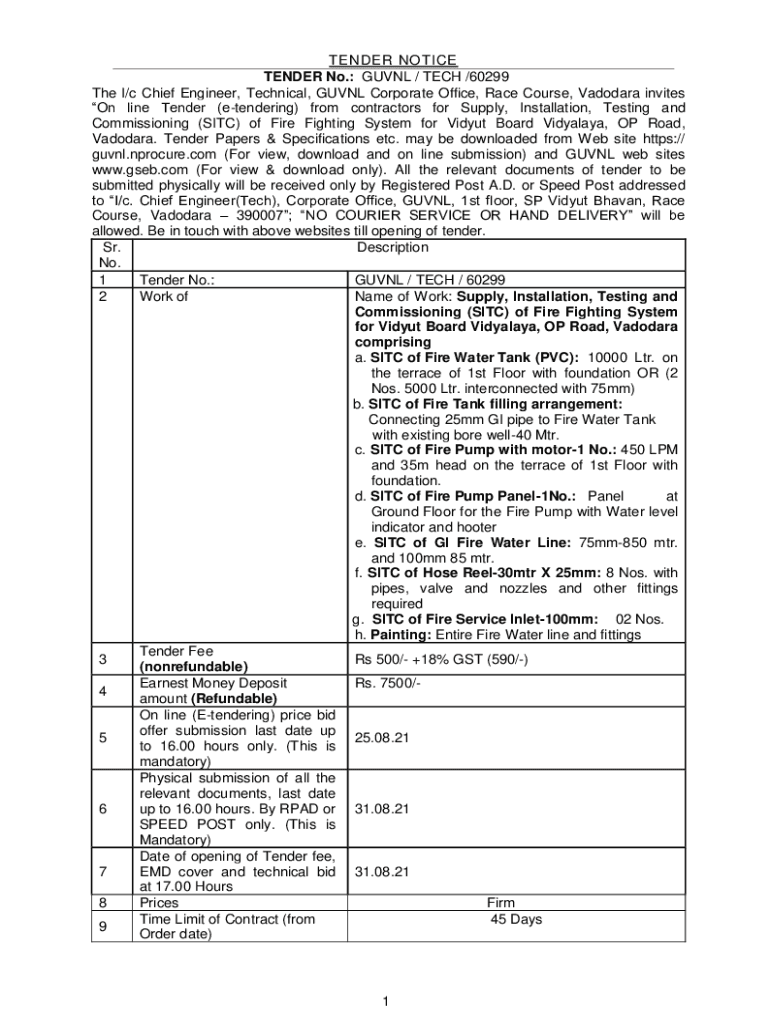 TENDER NOTICE TENDER No.: GUV NL / TECH /60299 The/c Chief Engineer, Technical, GUV NL Corporate Office, Race Course, Vadodara invites online Tender (tendering) from contractors for Supply, Installation,