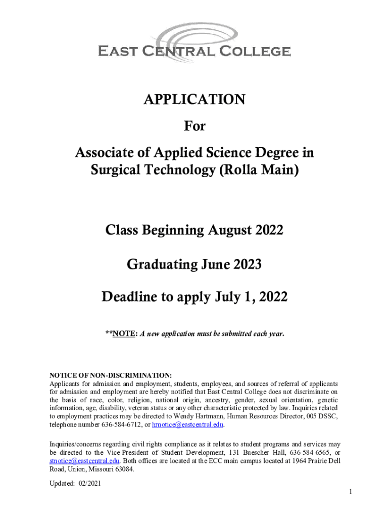APPLICATION For Associate of Applied Science Degree in Surgical Technology (Roll Main)Class Beginning August 2022 Graduating from June 2023 Deadline to apply July 1, 2022 **NOTE: A new application