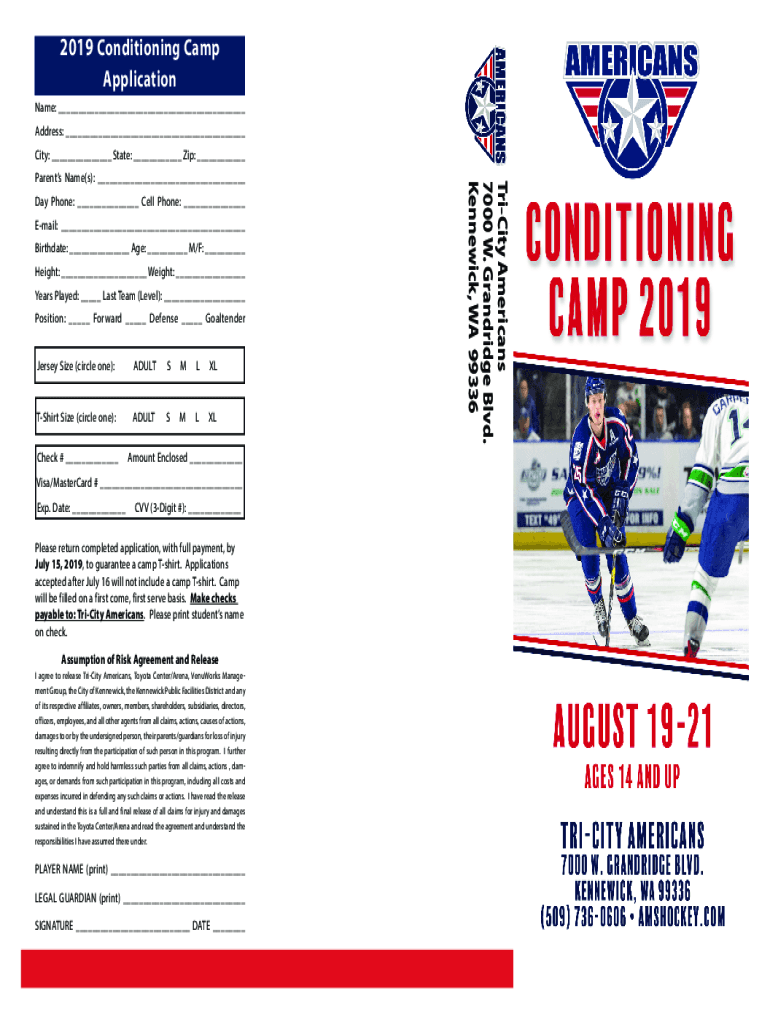 2019 Conditioning Camp Application Name: ___ Address: ___ City: ___ State: ___ Zip: ___ Day Phone: ___ Cell Phone: ___ Email: ___ Birthdate: ___ Age: ___ M/F: ___ Height: ___ Weight: ___ Years Played: