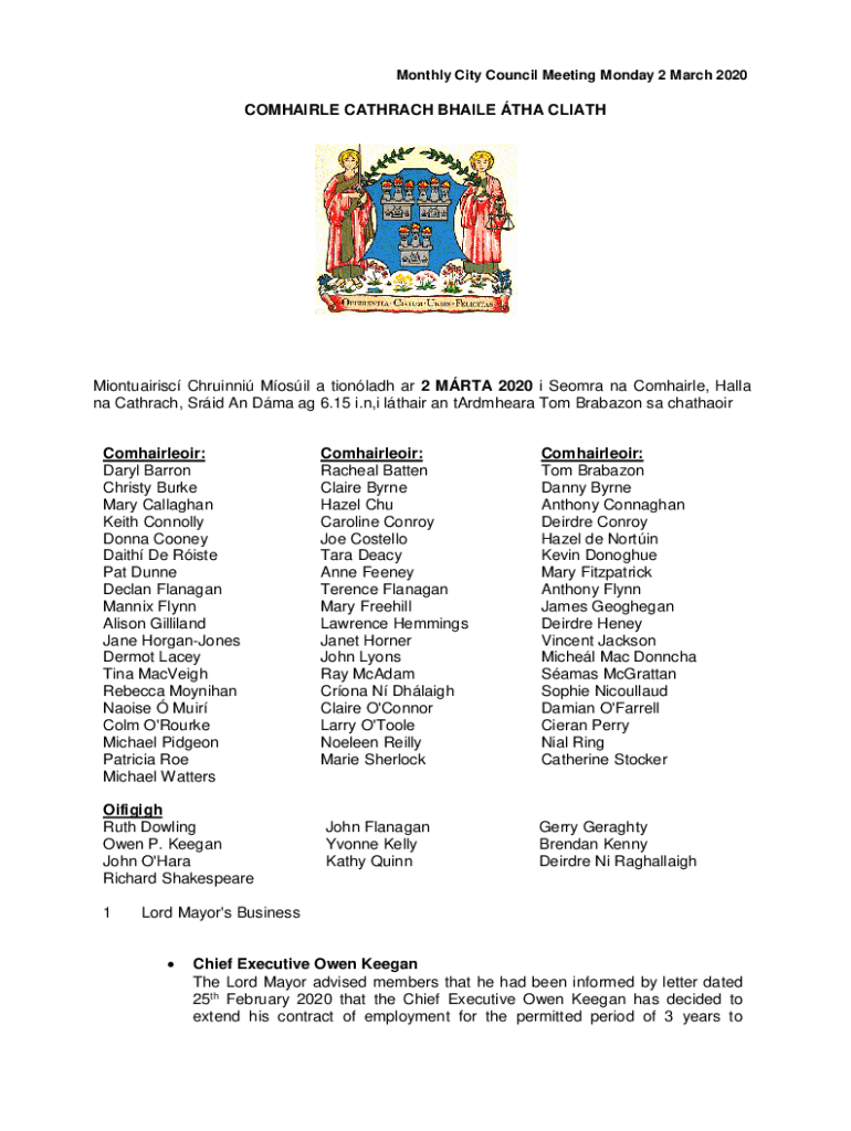 Monthly City Council Meeting Monday 2 March 2020COMHAIRLE CATARACT WHILE THA CLIATHMiontuairisc Christi Mobil a tionladh AR 2 MRT 2020 i Selma Na Compared, Halley