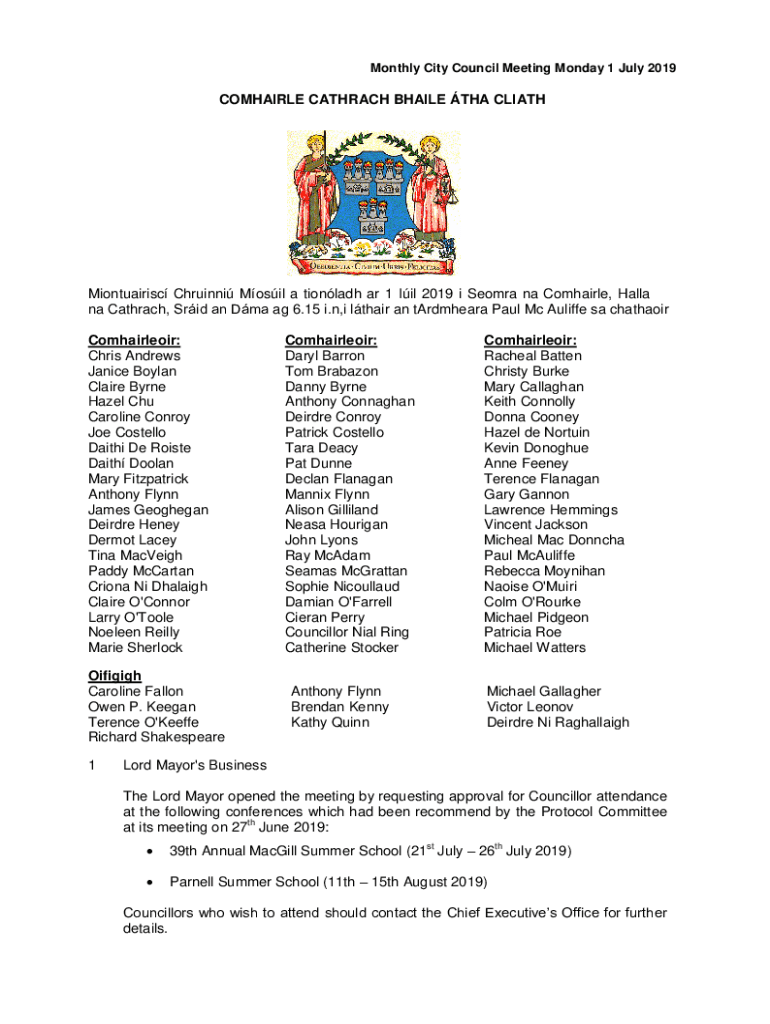 Monthly City Council Meeting Monday 1 July 2019COMHAIRLE CATARACT WHILE THA CLIATHMiontuairisc Christi Mobil a tionladh AR 1 Oil 2019 i Selma Na Compared, Halley