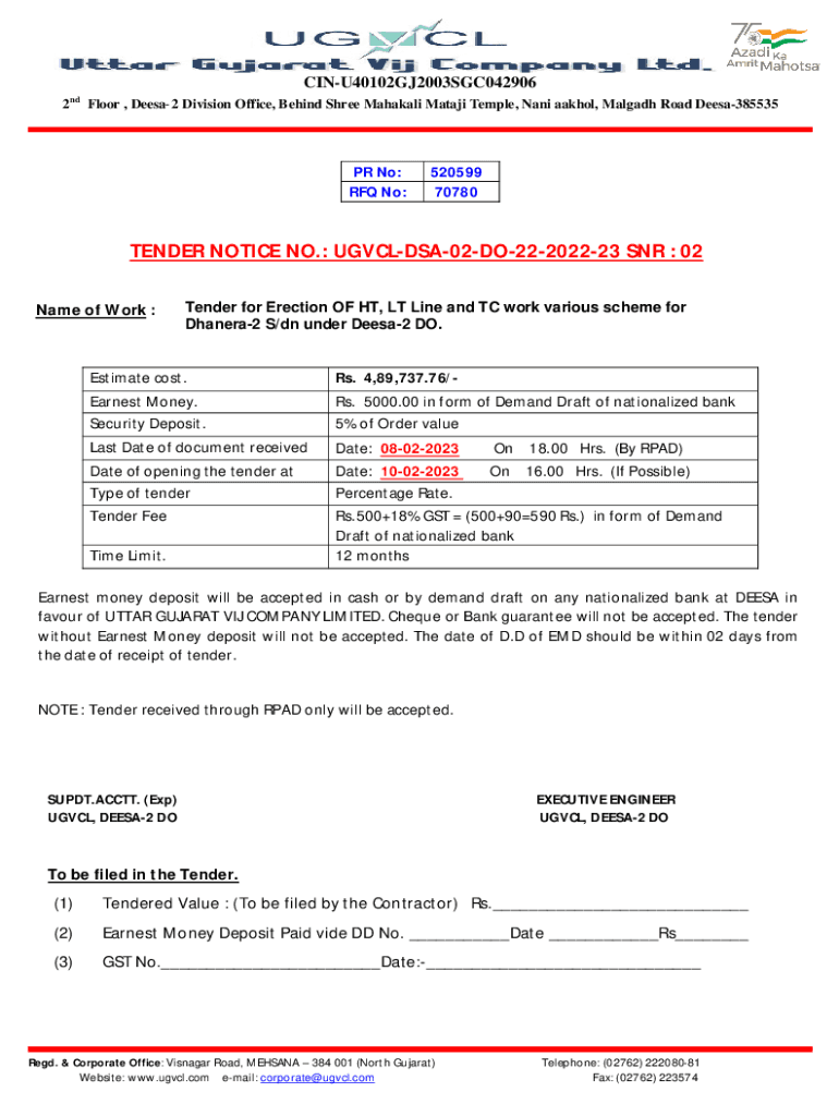 CINU40102GJ2003SGC042906 2ndFloor, Deesa2 Division Office, Behind Three Maharani Atari Temple, Nazi Warhol, Malady Road Deesa385535PR No: RFQ No:520599 70780TENDER NOTICE NO.: UGVCLDSA02DO22202223