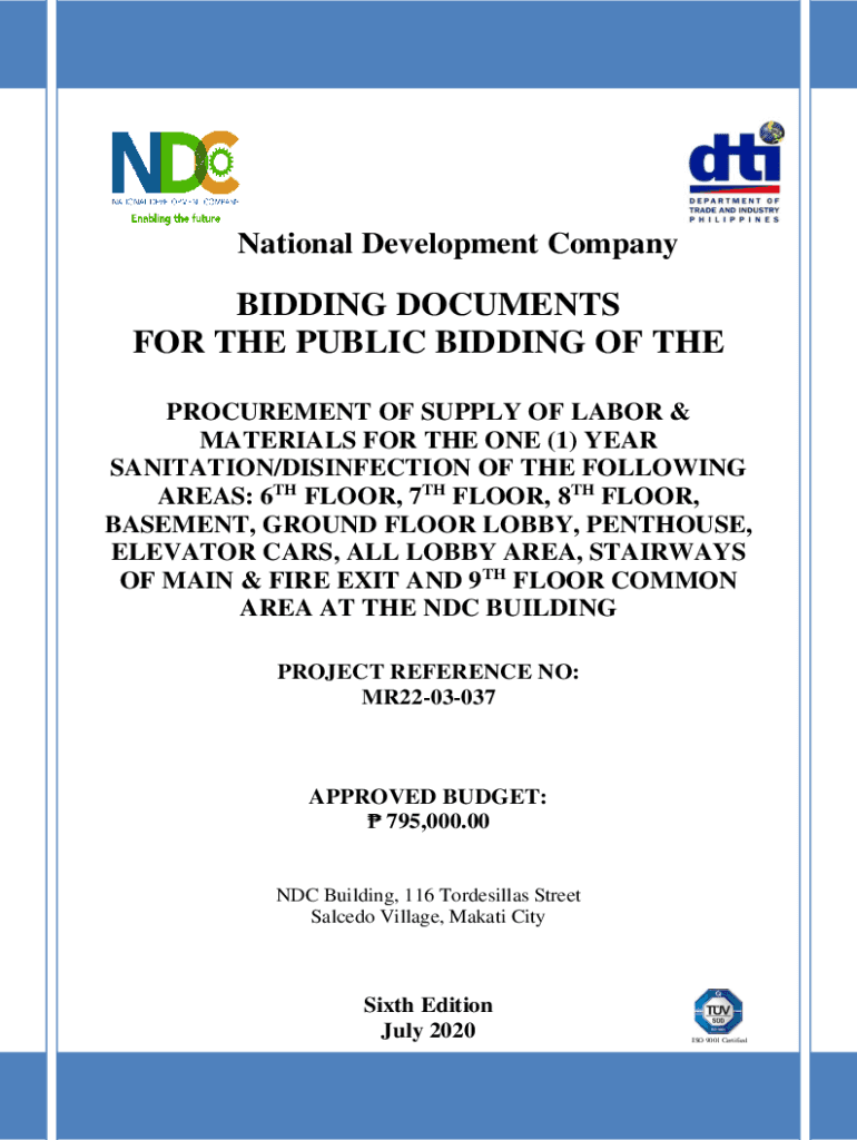 National Development CompanyBIDDING DOCUMENTS FOR THE PUBLIC BIDDING OF THE PROCUREMENT OF SUPPLY OF LABOR & MATERIALS FOR THE ONE (1) YEAR SANITATION/DISINFECTION OF THE FOLLOWING AREAS: 6TH FLOOR,