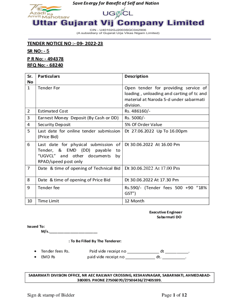 Save Energy for Benefit of Self and NationTENDER NOTICE NO : 09 202223 SR NO: 5 P R No: 494378 RFQ No: 68240 Sr. Particulars No 1 Tender ForDescriptionOpen tender for providing service of loading,