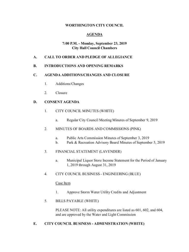 WORTHINGTON CITY COUNCIL AGENDA 7:00 P.M. Monday, September 23, 2019, City Hall Council Chambers A.CALL TO ORDER AND PLEDGE OF ALLEGIANCE.INTRODUCTIONS AND OPENING REMARKS.AGENDA ADDITIONS/CHANGES
